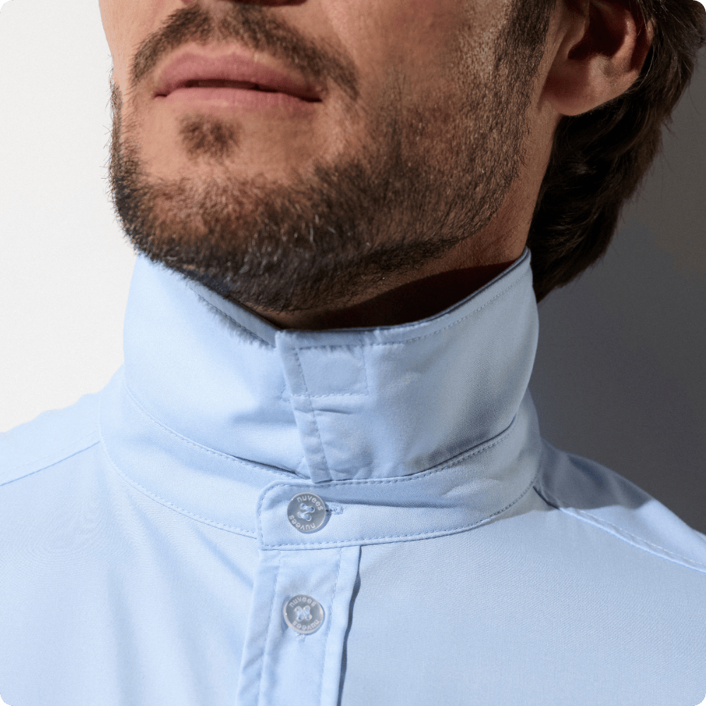 Per una protezione solare ottimale del collo e della nuca, il colletto può essere sollevato e tenuto in posizione con un piccolo e ingegnoso magnete. Le maniche sono progettate in modo da poter essere arrotolate e abbassate con eleganza. C'è anche una pratica tasca sul petto.